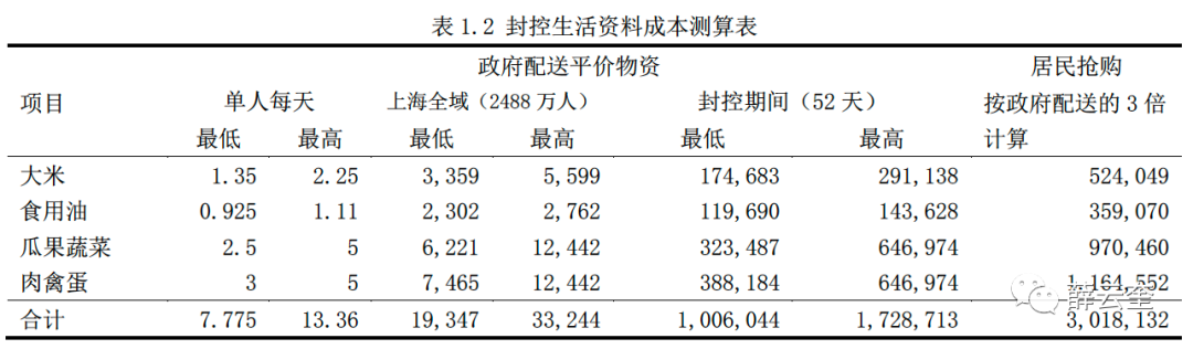 由于以上种种原因导致政府配送的物资浪费严重。很多有条件的家庭或社区又通过各种渠道补充各自的不足。根据亲身经验判断,个性化补充的生活物资可能占到生活所需物资的三分之一或一半,但由于抢购物资的价格和物流费用是政府配送物资的5-10倍,代价高昂。所以,初步估算这部分生活物资的总体成本大约是政府配送物资的3-5倍。我们且按3倍来计算,政府配送的物资成本为100亿元,而居民通过团购或个人拼运气在网上抢购的成本支出为300亿元。二者合计400亿元。具体计算过程如表1.2所示。