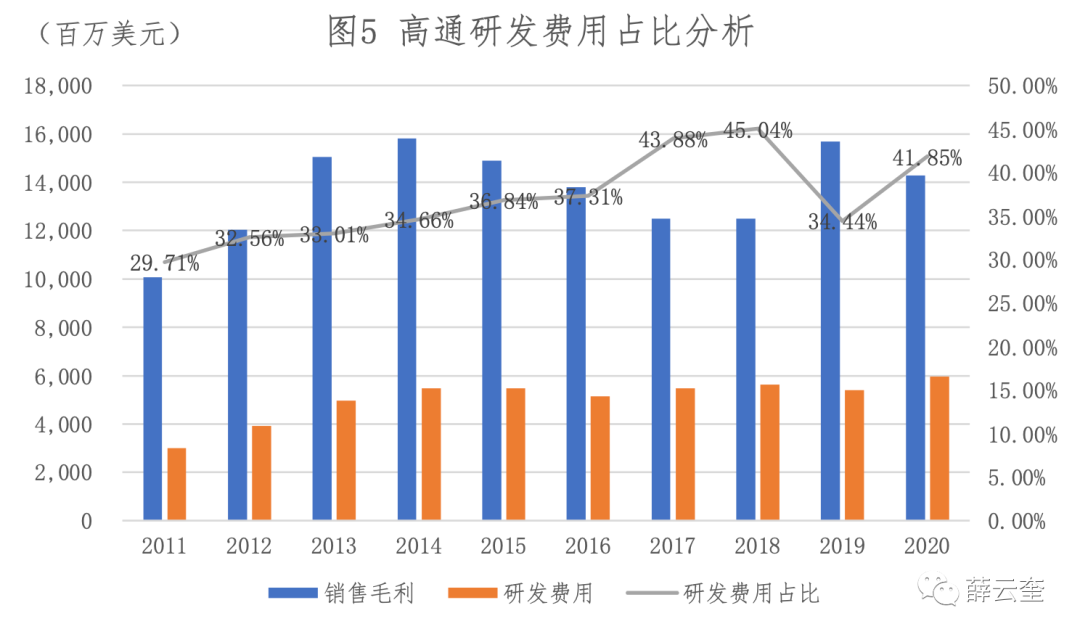 高通公司,是当前网络通信技术中的奠基者和佼佼者。在移动设备、网络设备、宽带网关和消费类电子设备中,诸多基础性核心技术都是高通公司的成就。如前所述,它专门有一家子公司——高通技术授权公司(QTL)负责向全世界的相关公司实施专利授权并收取专利使用费。高通公司为了保持它在技术上的领先优势,2020年投入研发经费60亿美元,略高于上年54亿美元,如图5所示,占销售毛利的41.85%。过去10年研发投入总量为501亿美元,占销售毛利的平均比重为36.95%,与华为不相上下。过去3~5年,高通有意识地加大了研发投入的力度。2017年占销售毛利的43.88%,较上年提升近6个百分点,2018年继续加大投入至45.04%。这是不是受了华为等中国公司快速成长的刺激?我们不得而知。