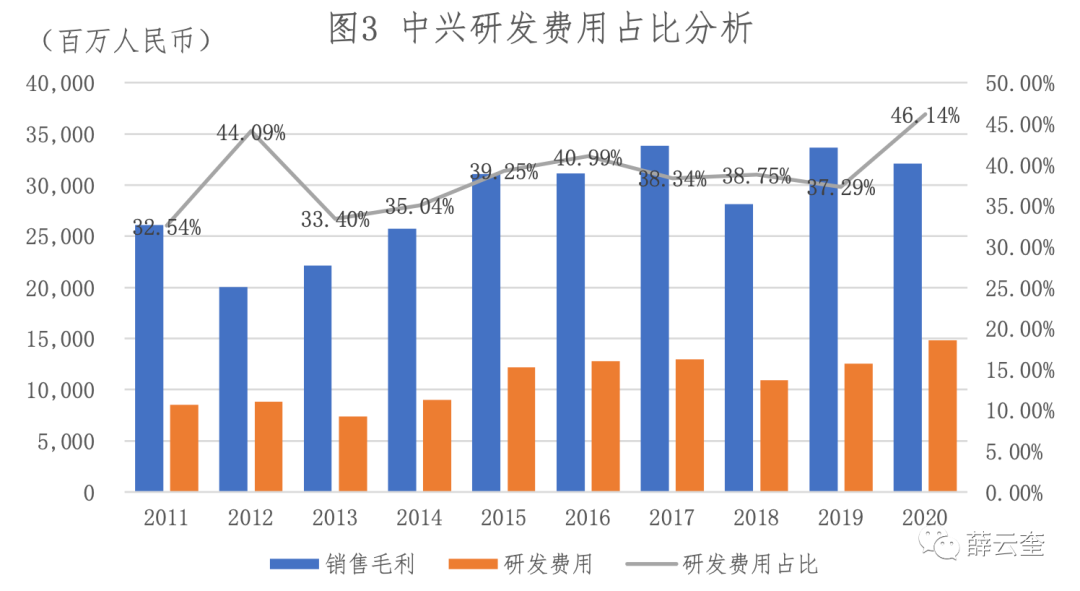 首先让我们来看中兴。中兴也是一家非常重视研发投入的公司,2020年合计投入人民币148亿元,虽体量上远不如华为,但其投入占销售毛利的比重如图3所示则高达46.14%,高于2019年126亿元的投入金额和37.29%的占比水平。表明中兴正在从美国的处罚中恢复元气。2018年被美国重罚当年,研发预算被压缩至109亿元,过去两年得以逐步恢复。
