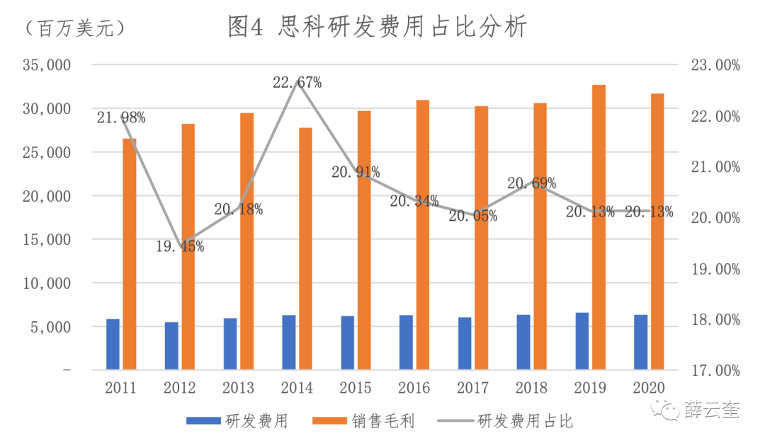 思科相对来说则处于某种市场优势地位。2020财年投入研发经费64亿美元,较上年的66亿美元略有下降,如图4所示,占销售毛利的20.13%,与上年完全持平。过去10年累计投入研发经费614亿美元,占同期销售毛利的20.61%。
