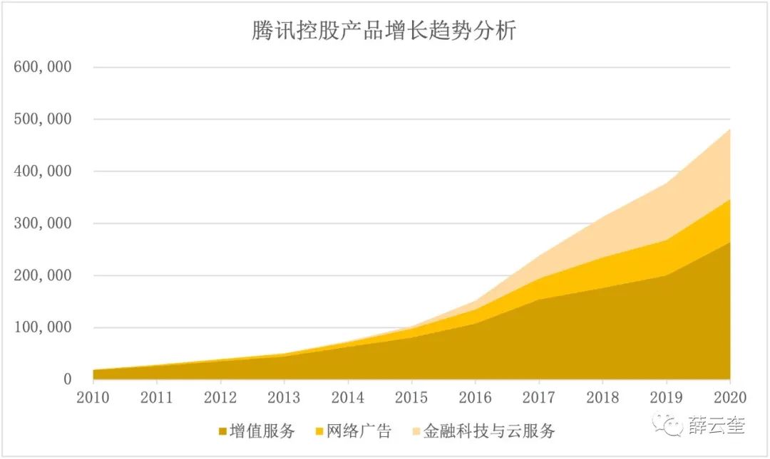 (2)超过50%以上的收入源自互联网增值服务(55%)收入。包括游戏服务收入与社交网络业务收入。其中,游戏服务收入占总收入的32.38%,主要源自在线虚拟道具销售。2015年及之前,其游戏收入超过总收入的50%,是一家地地道道的游戏公司。但在过去五年,游戏收入的占比逐次降低,网络广告收入、微信支付和云计算收入大幅度增长,表明公司逐步减轻了对游戏服务收入的依赖。