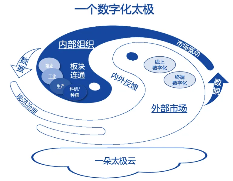 数据是数字化太极的源头活水,不断从市场需求中产生,驱动板块之间的连通,支撑规范治理。最终,通过内外反馈与市场需求的联动,不断迭代,形成数字化太极的正循环。