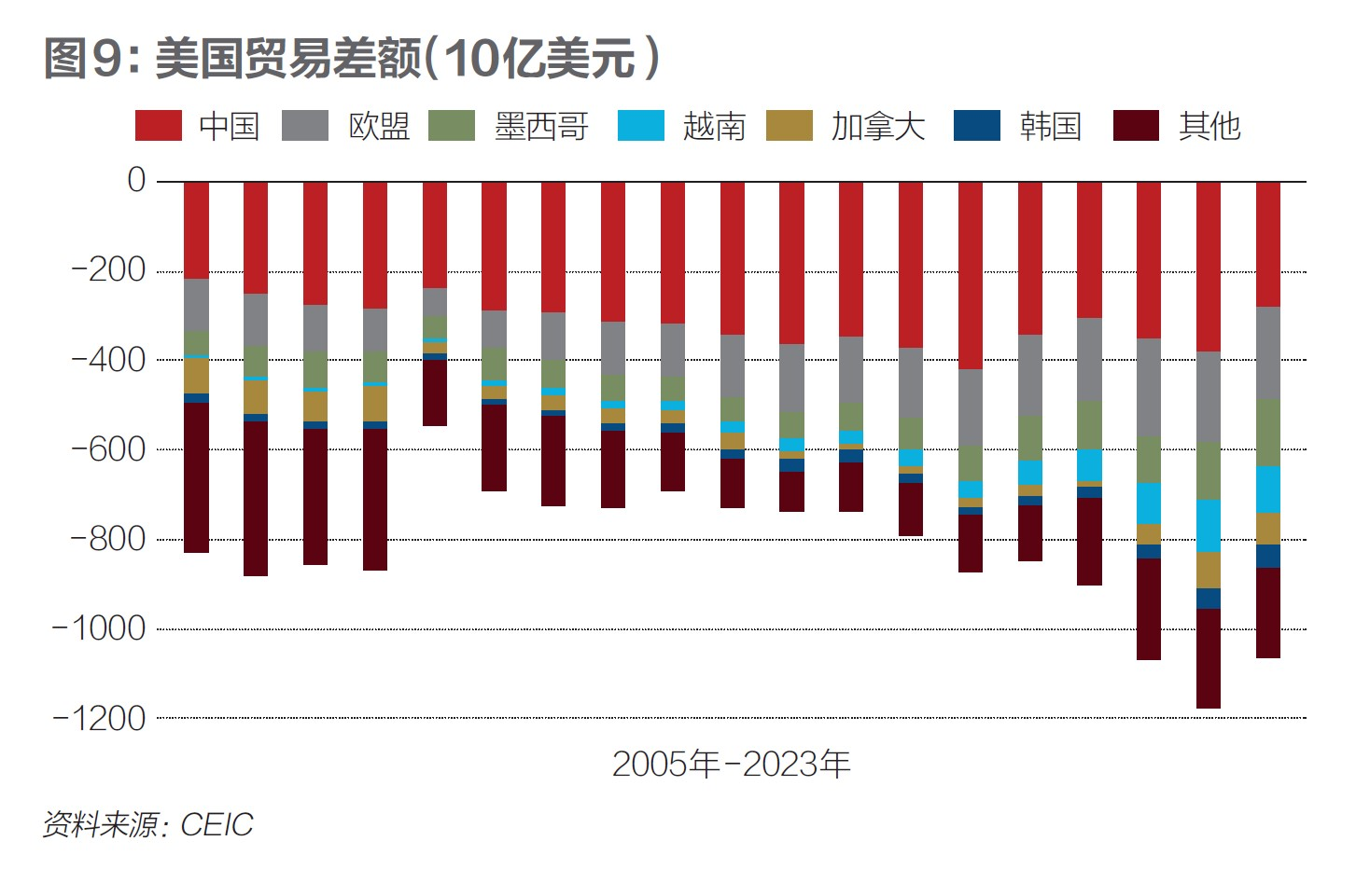图9是美国对不同经济体的贸易差额。中国、欧盟、墨西哥、越南是美国贸易逆差的主要来源地。从2018年到2023年,美国对中国的贸易逆差从4182亿美元缩小到2794亿美元,而对欧盟、墨西哥、越南的贸易逆差则呈现扩大的趋势。
