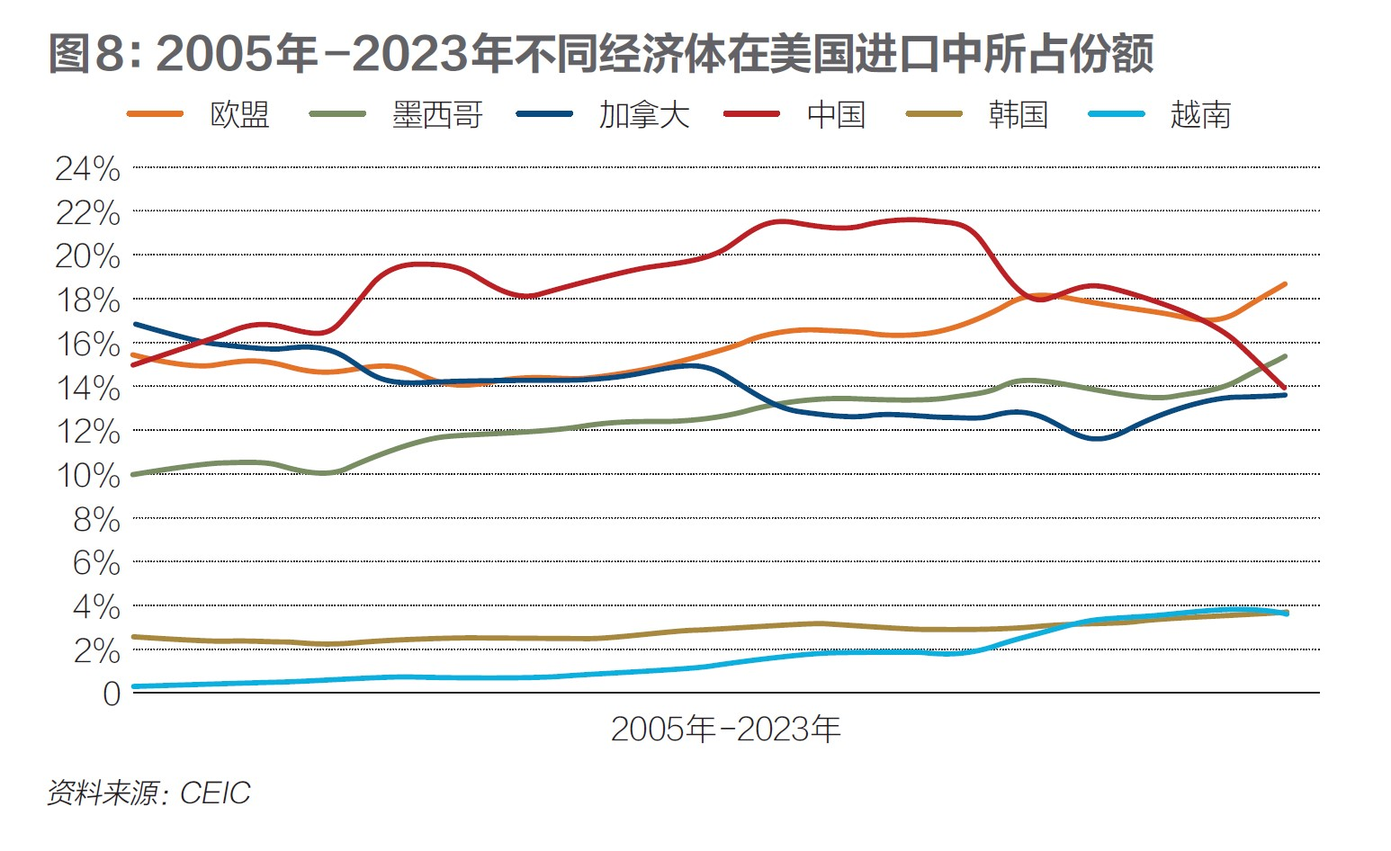 图7是2005年至2023年不同经济体在与美国贸易中所占比例。从2017年到2023年,中国在与美国贸易中所占份额降低5.07%,而欧盟、墨西哥、越南、韩国、加拿大在与美国贸易中所占份额分别提高2.87%、1.34%、1.03%、0.47%、0.20%。