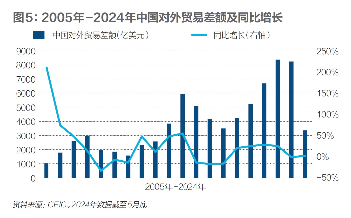 图5是2005年至2024年中国对外贸易差额及其同比增长。中国对外贸易差额经历了两轮明显的先下降、后上升的过程。2018年贸易顺差跌到近十年的最低点,但2019年贸易顺差同比增长20%,与贸易战爆发前的2017年持平。新冠疫情三年,中国贸易顺差逐年上升,2022年达到创纪录的8379.28亿美元。贸易顺差在2023年、2024年虽然同比小幅下降,但也保持在相对高位。