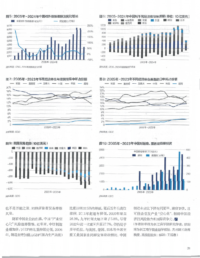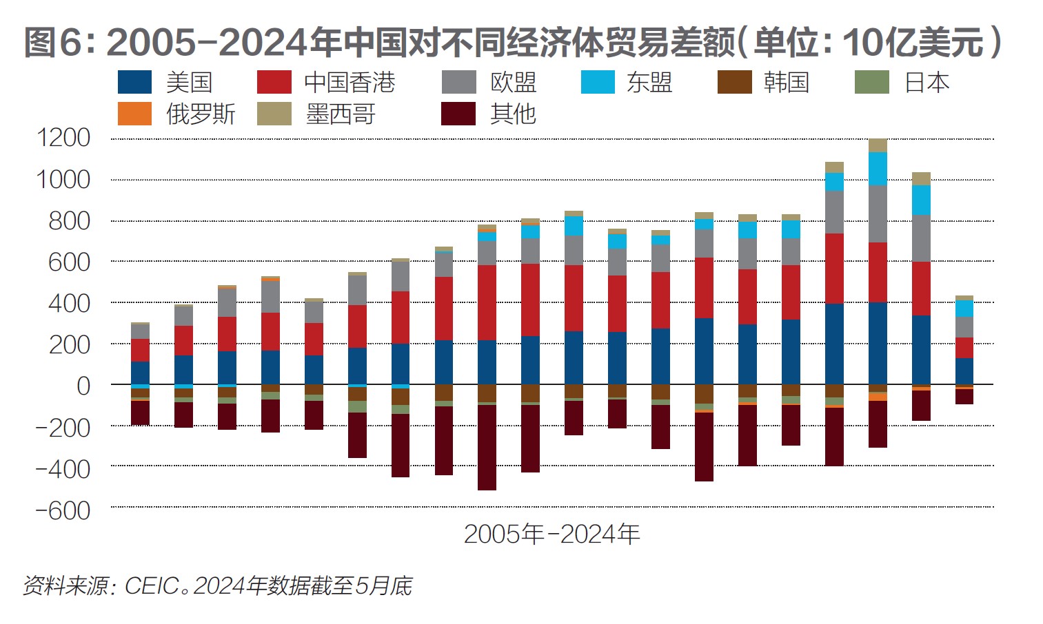 图6是2005年至2024年中国对不同经济体的贸易差额。美国、中国香港、欧盟与东盟是中国贸易顺差的前几大来源地,中国对墨西哥和东盟的贸易顺差在逐步增加。
