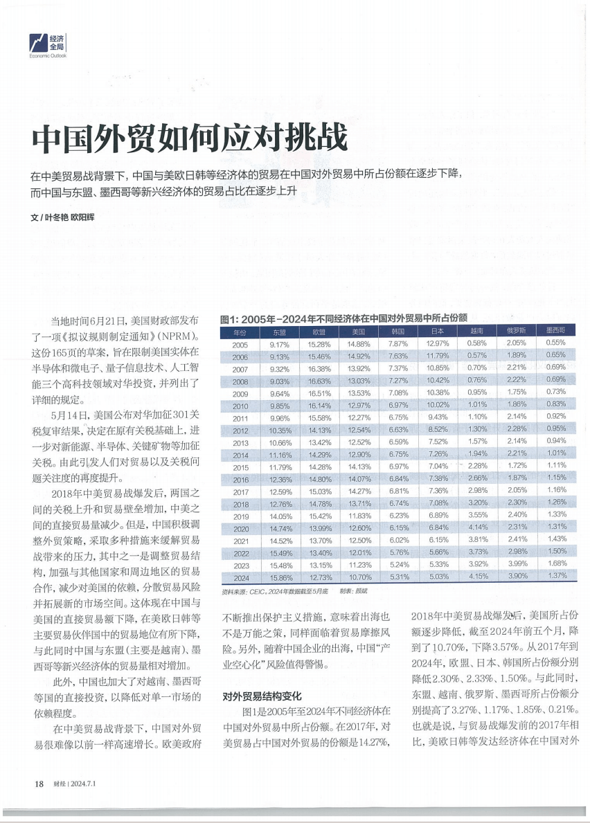 2018年中美贸易战爆发后,两国之间的关税上升和贸易壁垒增加,中美之间的直接贸易量减少。但是,中国积极调整外贸策略,采取多种措施来缓解贸易战带来的压力,其中之一是调整贸易结构,加强与其他国家和周边地区的贸易合作,减少对美国的依赖,分散贸易风险并拓展新的市场空间。这体现在中国与美国的直接贸易额下降,在美欧日韩等主要贸易伙伴国中的贸易地位有所下降,与此同时中国与东盟(主要是越南)、墨西哥等新兴经济体的贸易量相对增加。