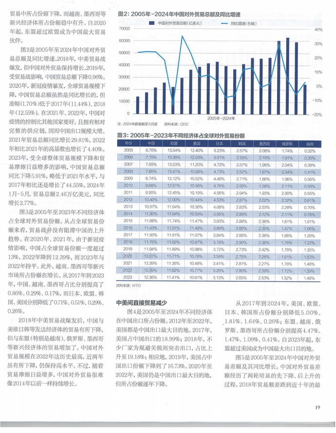 2018年中美贸易战爆发后,中国与美欧日韩等发达经济体的贸易有所下降,但与东盟(特别是越南)、俄罗斯、墨西哥等新兴经济体的贸易增加了。中国对外贸易规模在2022年达历史最高,近两年虽有所下降,仍保持高水平。不过,随着贸易摩擦日益增多,中国对外贸易很难像2014年以前一样持续增长。