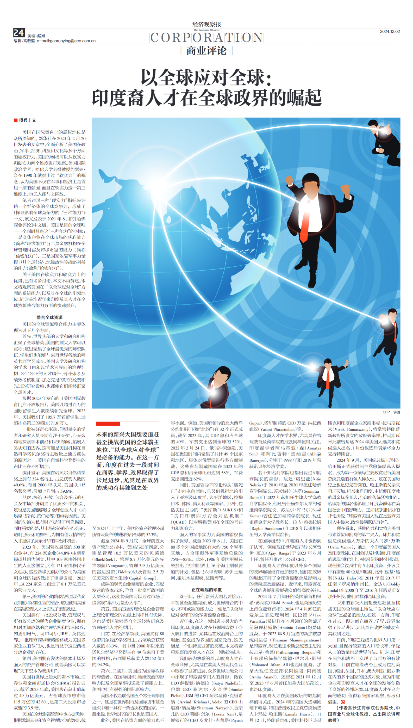 我们较为熟悉的是,印度裔人才在全球商界,尤其是在欧美大型现代企业中取得了显著进展,众多世界顶级公司中出现了印度裔掌门人的身影:微软CEO萨提亚·纳德拉(Satya Nadella)、谷歌 CEO桑达尔·皮查伊(Sundar Pichai)、IBM的CEO阿尔温德·克里希纳(Arvind Krishna)、Adobe的CEO山塔努·纳拉延(Shantanu Narayen)、香奈儿的CEO莉娜·奈尔(Leena Nair)、星展银行的CEO皮尤什·古普塔(Piyush Gupta)、诺华制药的CEO万桑·纳拉西姆汉(Vasant Narasimhan)等。