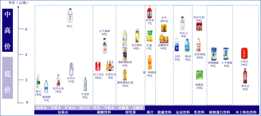 通过上图不难发现,传统品牌占据绝大多数,这说明大单品具有壁垒,是长坡厚雪的赛道……正因如此,近年来饮料领域最大的商业现象,还是要归属于元气森林——它证明了纯国产、新品牌、高价格、外行团队,也能在3、5年内彻底搅动市场……其启发与推动了饮料行业的创业浪潮。其用500ml售价6元,面对同规格3元左右的可乐,其撕开的“价格带”让创业与创新有了施展的空间。