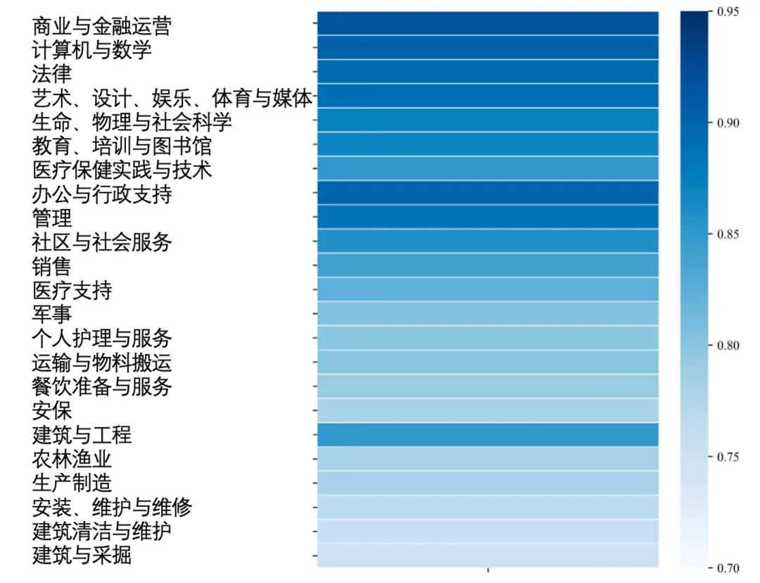 ● 研究为518个职业类别分别构建了完整的“智能需求画像”,衡量大模型是否“具备胜任岗位所需智能”,发现:AI大模型与计算机、法律、金融、新闻编辑等“智能密集型”知识岗位适配度最高;而在服务类、生产制造、运输物流类岗位,AI智能适配度偏低。