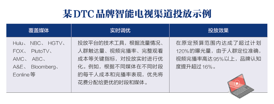 国内某DTC(直面消费者)品牌在海外已有超过5年的品牌操盘经验。以往,它主要通过代理公司在谷歌、Facebook等“围墙花园”平台上进行效果广告的投放。由于买量价格不断提高,对品牌的认知不断提升,程序化投放平台逐渐成熟,它开始尝试新的投放平台与渠道,比如智能电视。