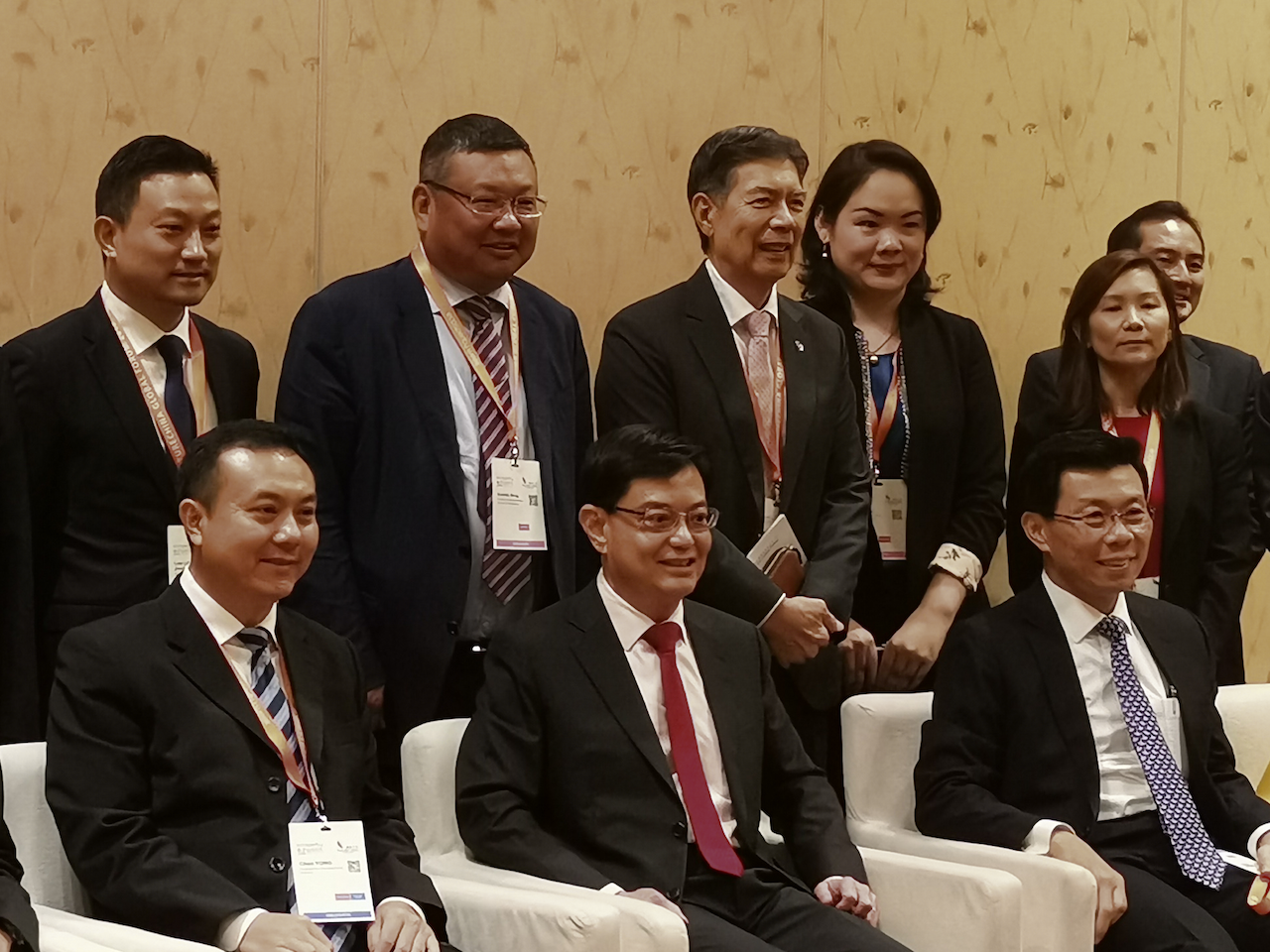 项兵院长(后排左二)与新加坡副总理兼财政部长王瑞杰先生(前排左二)、通商中国主席李奕贤(前排右一)